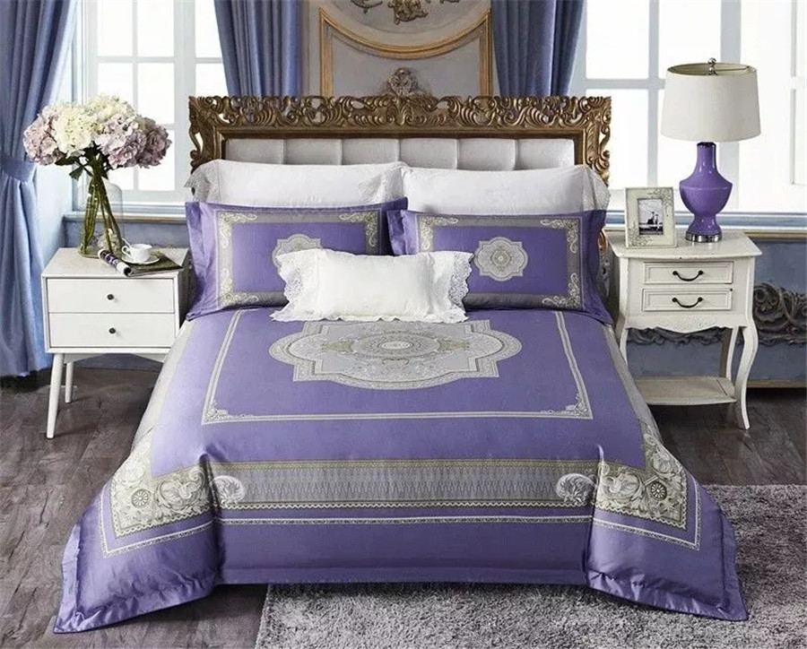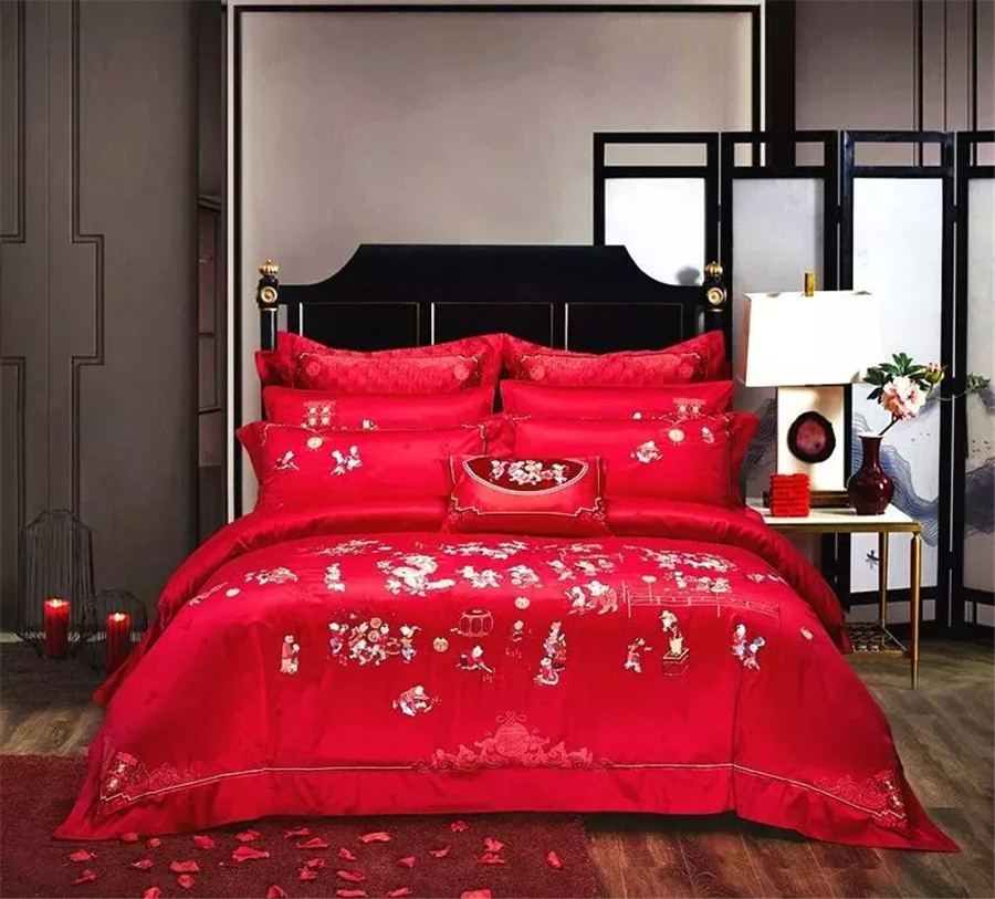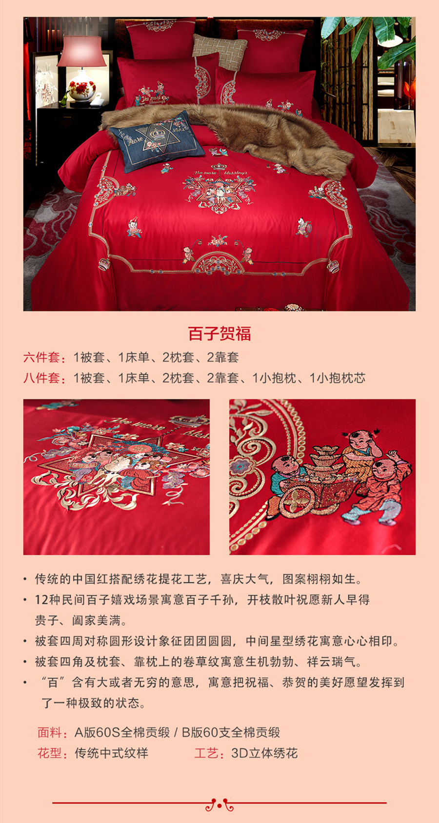 一套床品是結婚當天使用,最好是采用大紅色進行裝點,紅色看上去會非常喜慶,而且可以納福辟邪,花型則多是選擇牡丹花、鳳尾花、百合花等花型紋樣,符合當?shù)厝巳崦姥胖碌钠肺?。另外兩套床品是在結婚后的兩三天使用,這些床品可以采用較溫馨的系列來裝扮(如粉色、紫色、金色),最后三到七套床品是常用款,就是日常換洗使用的購買簡單大方樣式的床品即可。