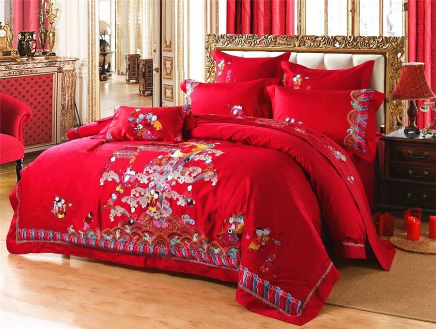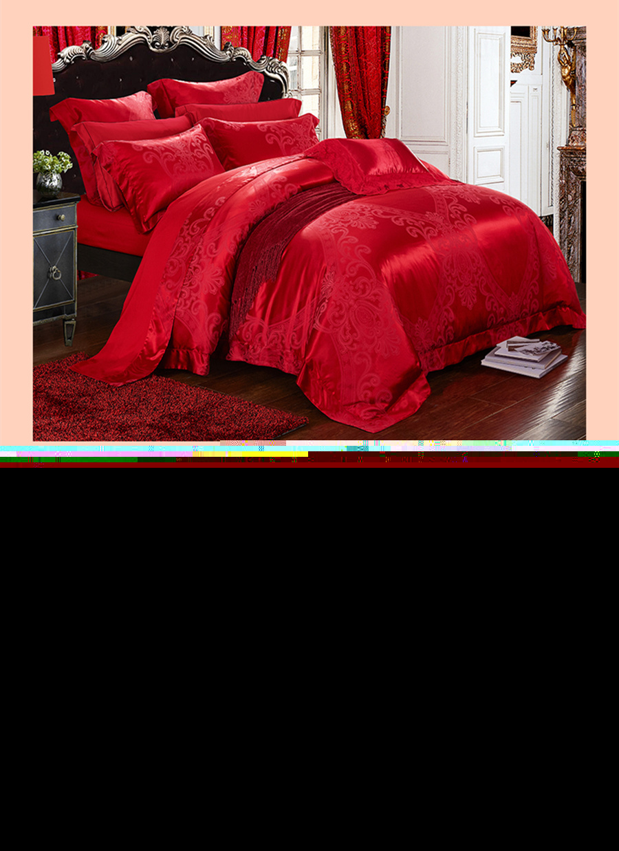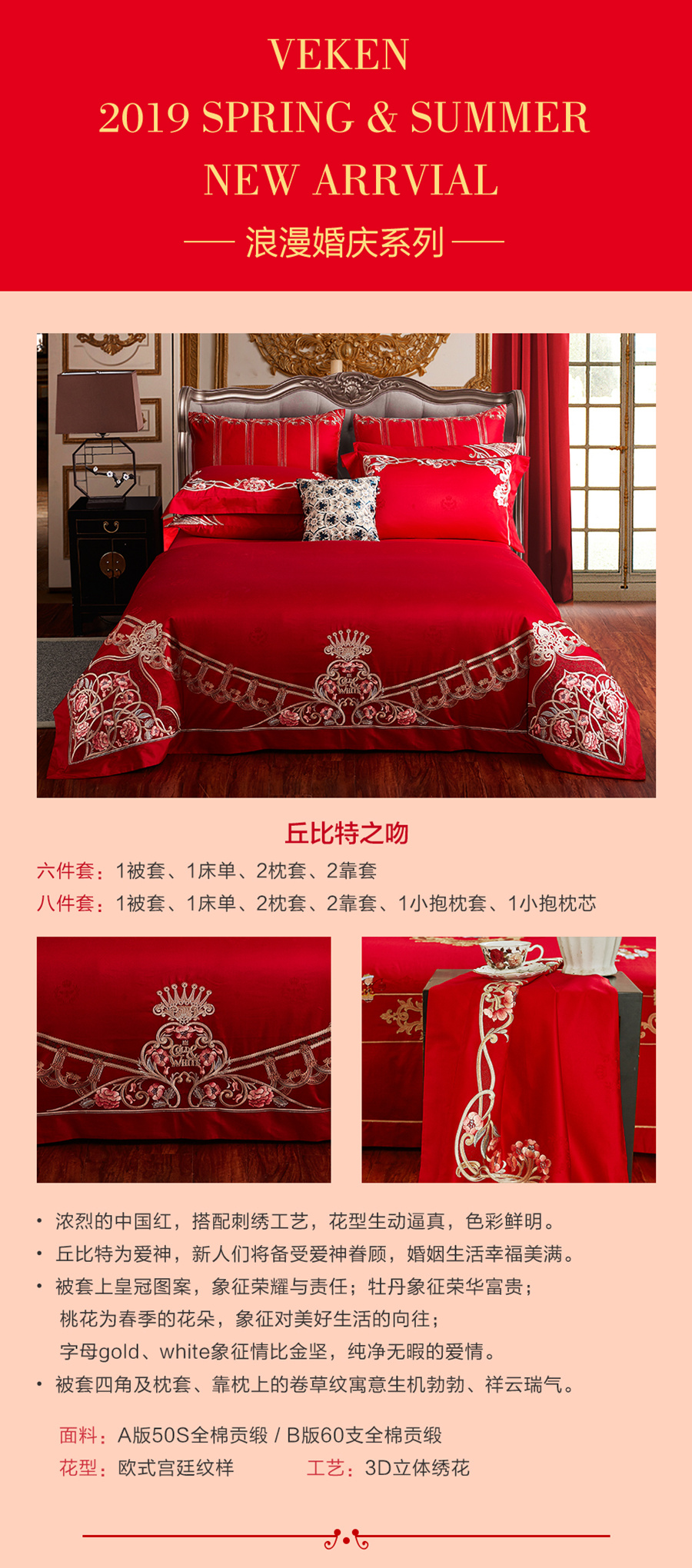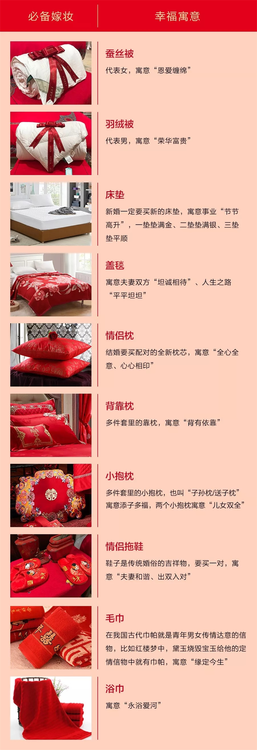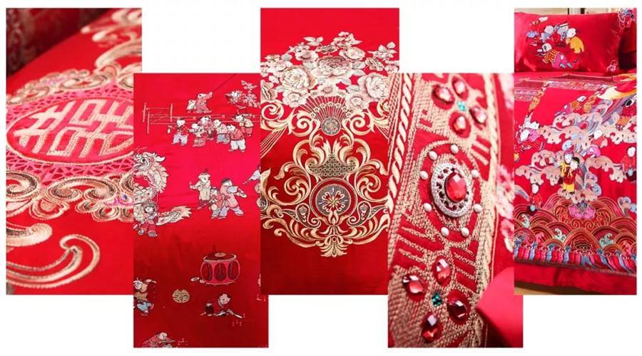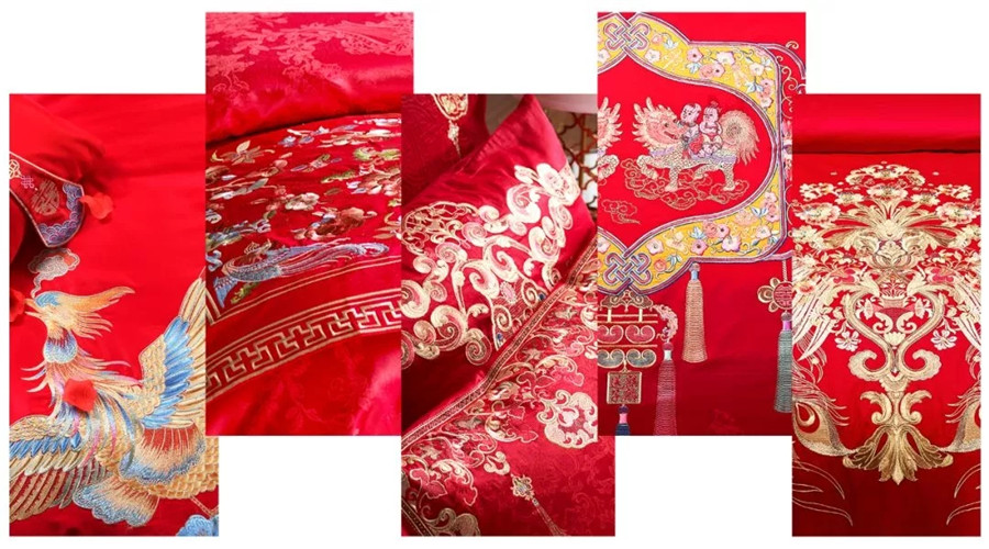中國紅是中國人結婚必須的顏色,結婚當天一定需要鋪一套紅色的床品,即鎮(zhèn)宅也象征新人從此紅紅火火幸福美滿。