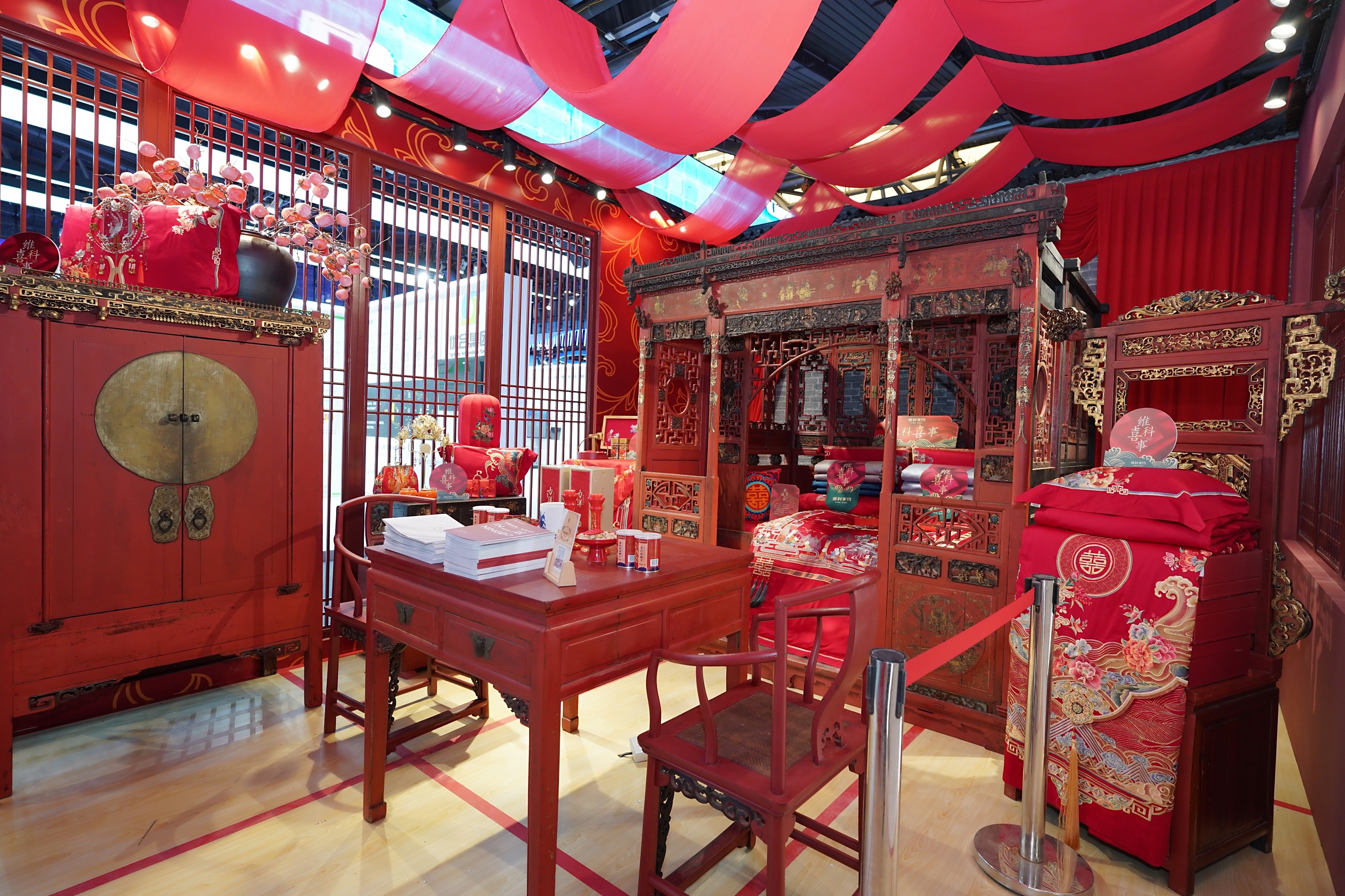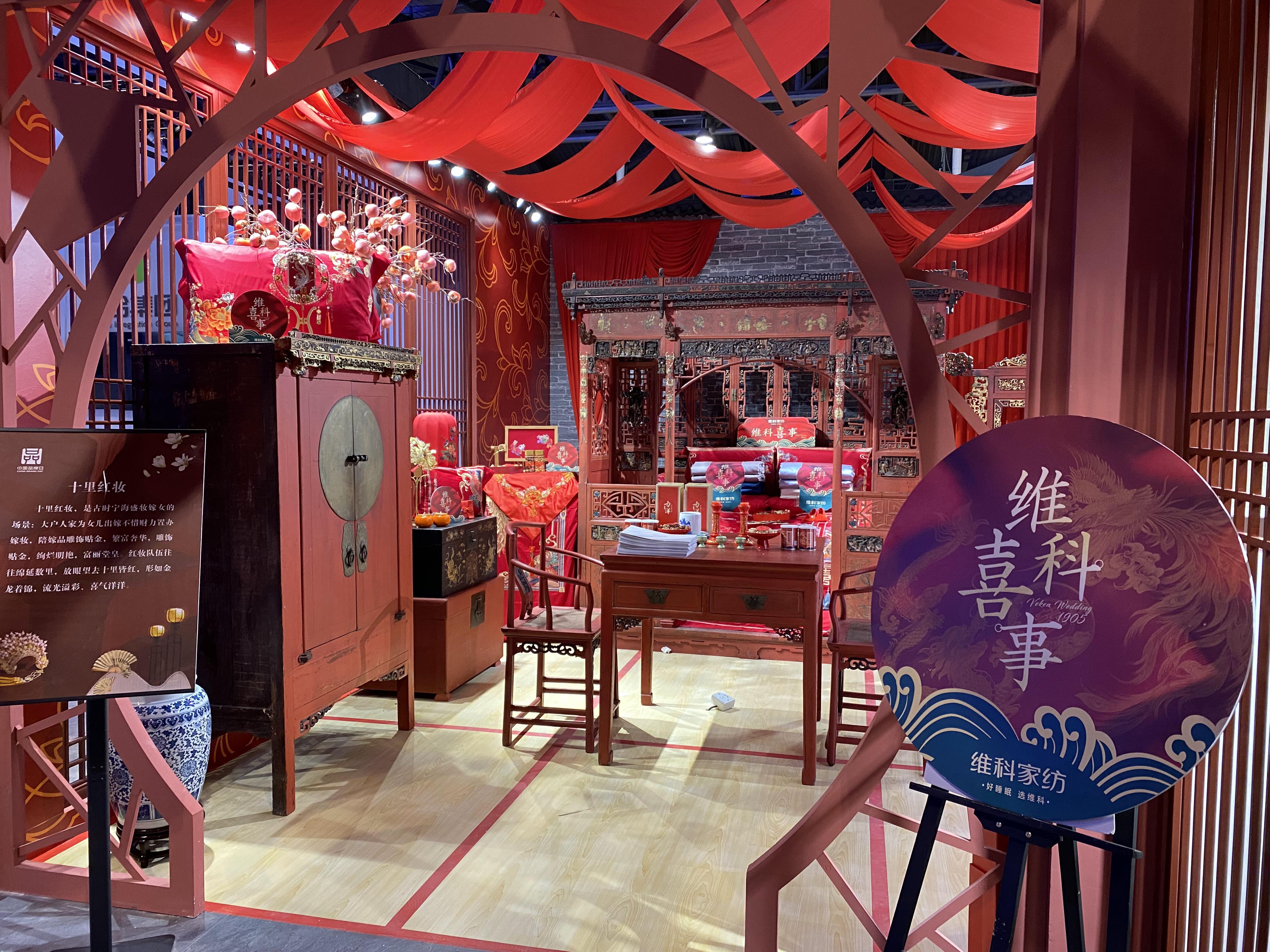 寧波發(fā)改委的相關(guān)負(fù)責(zé)人表示,由維科家紡精心打造的古代婚房是本次寧波館展廳的一大亮點(diǎn)。通過重工刺繡的婚慶套件【百子百?!俊君堈馒P彩】【錦繡年華】、華美的鳳冠喜扇等展品,結(jié)合收藏夾協(xié)會(huì)提供的長達(dá)兩百年歷史的古董家具,展現(xiàn)了濃厚的婚慶氛圍和傳統(tǒng)文化的精髓,將“十里紅妝”的獨(dú)特魅力展現(xiàn)得淋漓盡致。