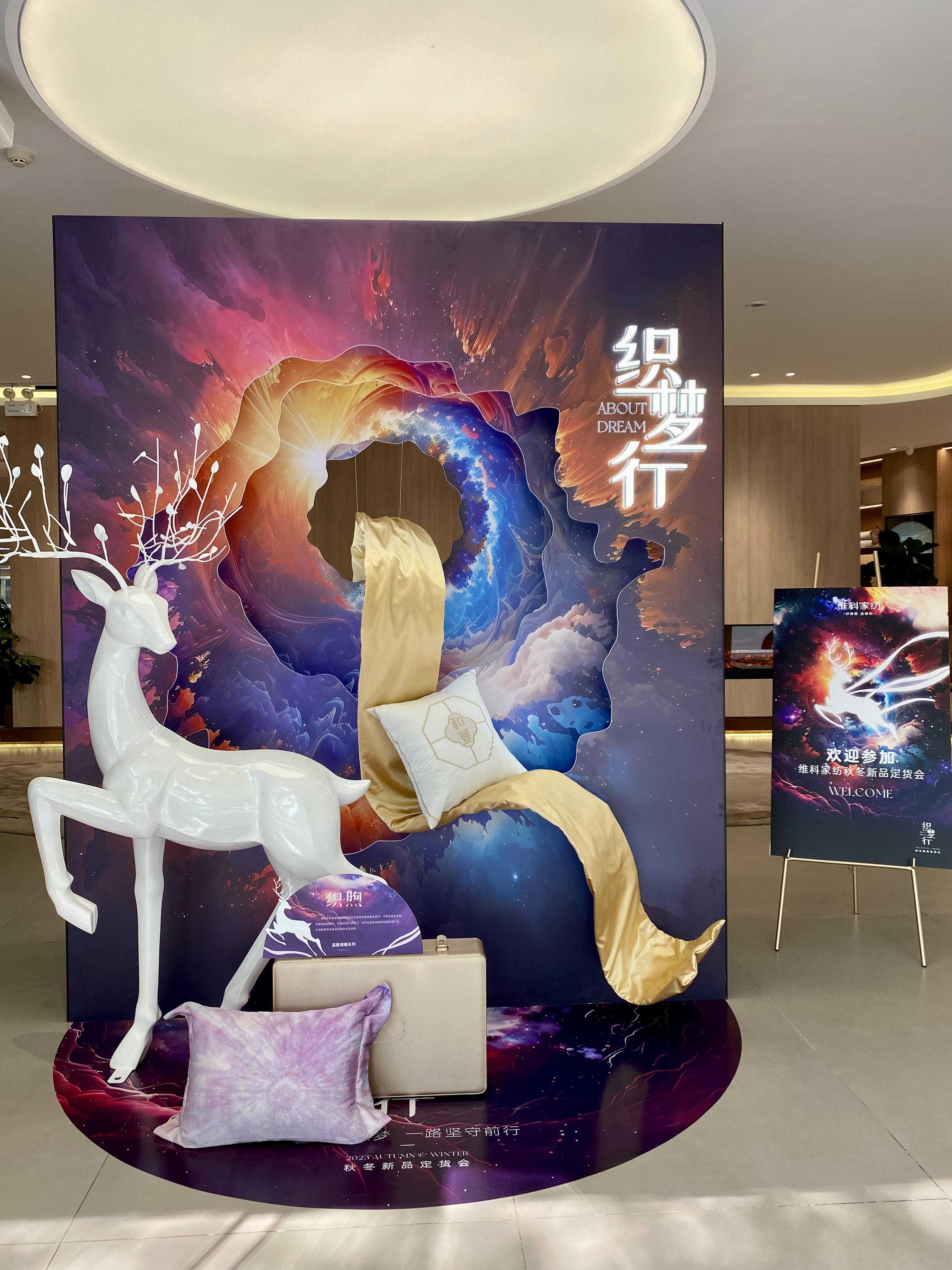 作為定貨場地的維科家紡總店,其陳列布置秉承“織夢行”主題,將夢幻元素與現(xiàn)代風(fēng)格相融合,打造出一系列充滿想象力和溫暖的場地。