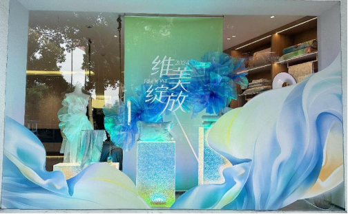 作為發(fā)布會場地的維科家紡總店,其陳列布置秉承“維美綻放”主題,將花卉元素與現(xiàn)代風格相融合,打造出一系列充滿想象力和詩意流動的場景。